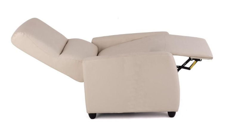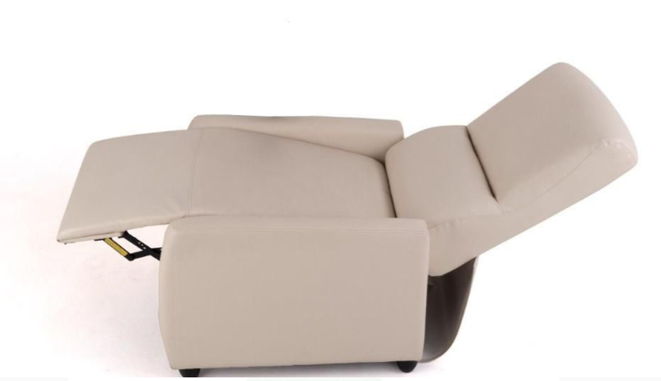 Poltrona reclinável com chaise mecânica. Sistema manual de fácil acionamento. Basta pressionar o encosto com as costas para reclinar. Revestimento em couro ecológico vinílico.