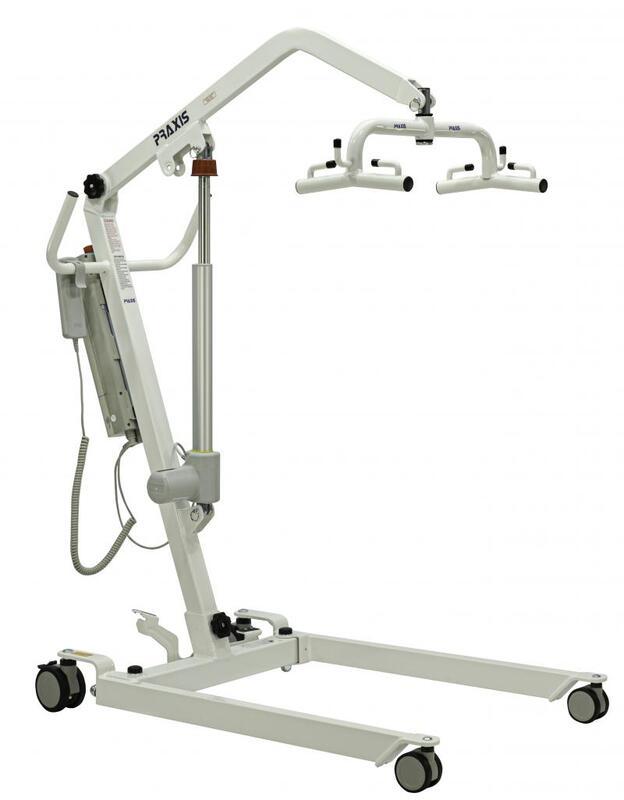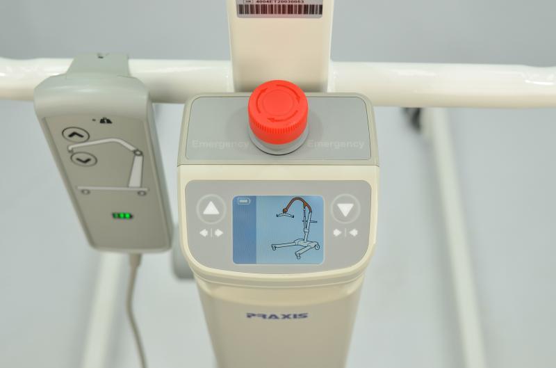 Guincho Elétrico Praxis. Desenvolvido para facilitar a transferência de pacientes idosos, obesos, portadores de necessidades especiais ou limitação de locomoção, permanente ou temporária entre a cama, cadeira de rodas ou de banho, vaso sanitário e outros. Auxilia na prevenção da osteoporose, por proporcionar maior descarga de peso nos membros inferiores, permitindo uma movimentação confortável e com segurança ao usuário e ao operador. Construído em aço carbono tubular. Bateria recarregável com carregador bivolt. Acionamento através de controle remoto e ou painel. Capacidade de levante de até 180kg. Colete resistente e lavável.